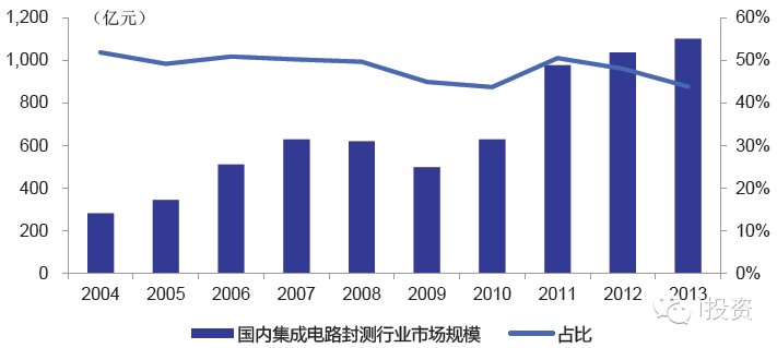 2013 年国内集成电路封测行业产值占到集成电路行业产值的44%,并且在过去十年始终保持在40%以上的很高水平。如此高的产值占比主要是由于在半导体产业链上,封装与测试环节具有技术壁垒相对最低、劳动力成本要求最高和资本壁垒较高的特点,所以国内最适合半导体封装测试行业发展,从而使得封装与测试环节一直占据国内集成电路产业链的主导。这就从侧面表明了国内半导体封测环节较全球半导体行业显得更为重要。