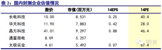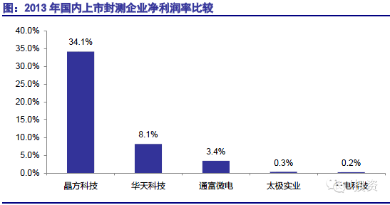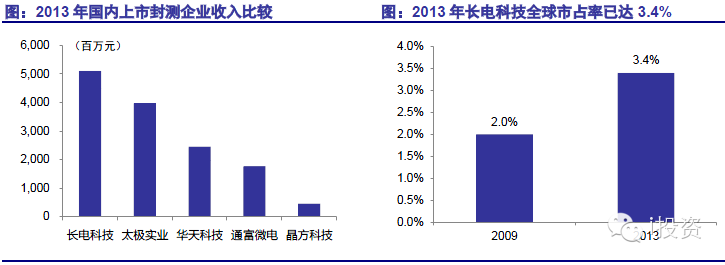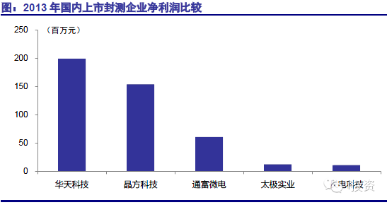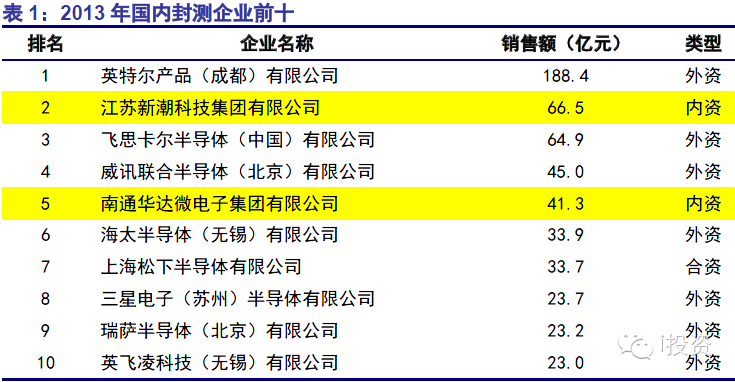 不过,目前国内封测市场基本被国际IDM 大厂的封测厂占据。国内前十名封测企业中内资本土厂商仅有两家,长电科技的母公司江苏新潮科技和南通华达微电子,2013 年分别实现销售收入66.5 亿和41.3 亿。