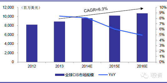 WLCSP 封装技术最主要的应用领域影像传感器(CIS)市场规模巨大,2013 年约90亿美元,同比增长8%。根据WSTS 预测,未来三年CIS 行业复合增长率为6.3%,增长速度较慢。不过,我们认为采用WLCSP 封装技术的CIS 产品更具价格优势,增长速度会快于行业平均增速。