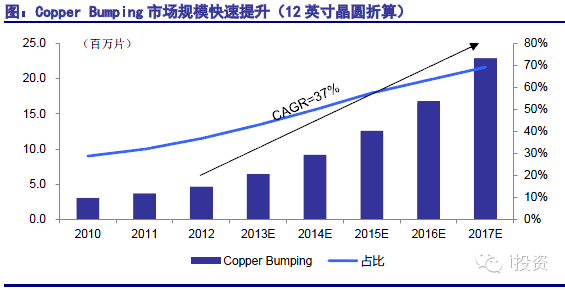 I/O 引脚密度的提升是IC 封装技术进步永恒的目标,Copper Bumping 技术是实现这一目标并且适用于先进制程芯片的必然趋势,从而成为了全球封测大厂必争之地。据Yole Developpement 预计,2017 年全球Copper Bumping 市场规模将达到2300万片/年(12 英寸晶圆折算,后同),对应2012 年不到500 万片/年的市场规模年复合增长率高达38%。这主要受益于Bumping 技术本身市场规模年复合20%以上的快速增长,以及Copper Bumping 技术对其他材料Bumping 技术的逐渐替代,CopperBumping 占比将从2012 年的37%提升到2017 年的69%。