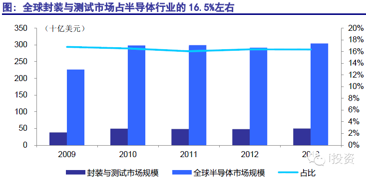 根据Gartner 的统计,2013 年全球半导体封装与测试行业市场规模为498 亿美元,较上年同比增长4.1%,近五年年复合增长率为5.5%,占全球半导体行业市场规模比值为16.4%。过去五年,封装测试环节在整个半导体产业中产值占比一直非常稳定,始终保持在16%-17%这个稳定区间。