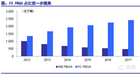 FC 技术作为先进半导体封装技术的基础啊,未来市场规模将实现持续快速增长。一方面受益于市场总需求的提升,另一反面则是对传统WB 技术的快速替代。在PBGA 领域,目前FC 技术已经超越WB 技术占比为57%,未来将继续受益于计算机、通讯产品、多媒体设备的需求进一步拉开差距。预计到2017 年,FC PBGA出货量将达到24亿颗,年复合增长率为12%,占比达到83%。