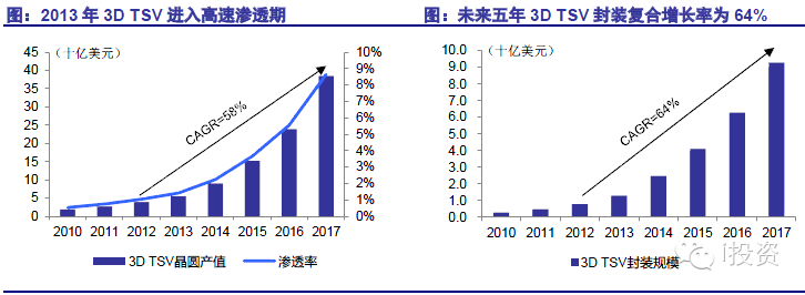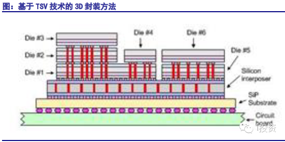 基于TSV 技术的3D 封装相对于2.5D 封装,不仅是在硅中介层上采用TSV 技术,而且在芯片上也采用TSV 技术,使堆叠的芯片能够实现垂直互联,大幅减少3D 封装芯片间的连接距离,真正实现3D 封装优势,是未来先进封装技术演进方向。不过,目前这一封装方法还处在技术导入期,高速渗透期的到来还要依赖TSV 技术的继续进步和成本的降低。