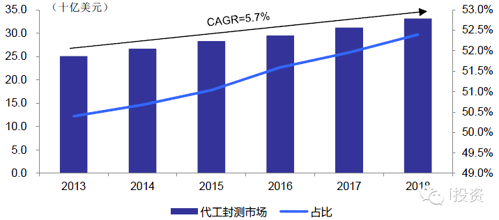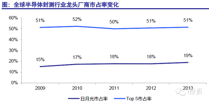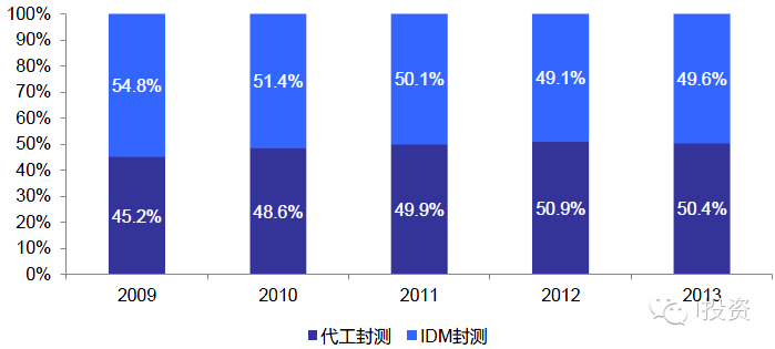 因此在过去几年,专业代工封测行业市场份额占比逐年提升,从2009 年的45.2%增长到了2013年的50.4%。