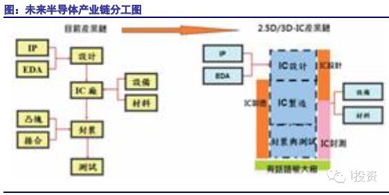 未来随着封装形式向2.5D/3D 封装技术演进,半导体产业链各环节之间的关系将进一步融合。晶圆制造和封装测试将不再具有明确的分界线,两个环节将进行相互渗透。各环节的龙头厂商将在整个半导体产业链上拥有更大的影响力,因此看好技术优势明显市场规模大的龙头企业在未来将占据更大的市场份额。