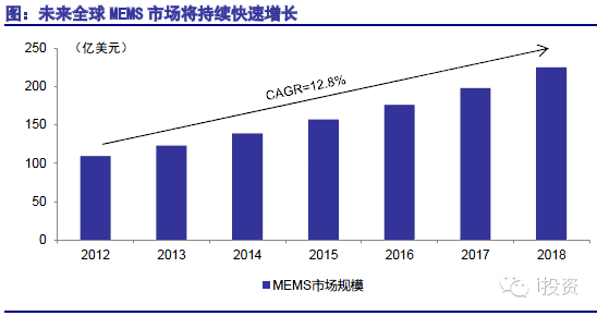 微机电系统(MEMS)是未来WLCSP 封装技术实现持续增长的主要推动力。随着智能手机、平板电脑对轻薄化智能化的不断追求,以及未来可穿戴设备、智能家居、智能汽车、物联网等领域的不断兴起,MEMS 产品的需求将有望出现爆炸式增长。2012 年全球MEMS 产品市场规模为110 亿美元,预计2018 年全球市场规模将达到225 亿美元,对应年复合增长率为12.8%。