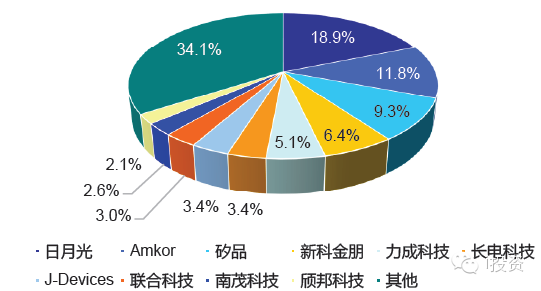 从集中度变化趋势来看,过去五年半导体封测行业龙头厂商日月光和Top5 厂商的市占率都基本维持稳定。日月光的市占率基本维持在18%左右,呈缓慢增长趋势;行业Top 5 厂商的市占率则一直保持在51%左右,这表明封测行业龙头厂商基本保持和行业同步增长的状态。从而对于处在追赶状态的中国本土封测厂商非常有利。