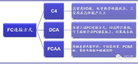 倒装芯片有三种主要的连接形式:控制塌陷芯片连接 (Controlled Collapse ChipConnection,C4)、直接芯片连接 (Direct chip attach,DCA)和黏着剂连接的芯片FCAA(Flip Chip Adhesive Attachement)。