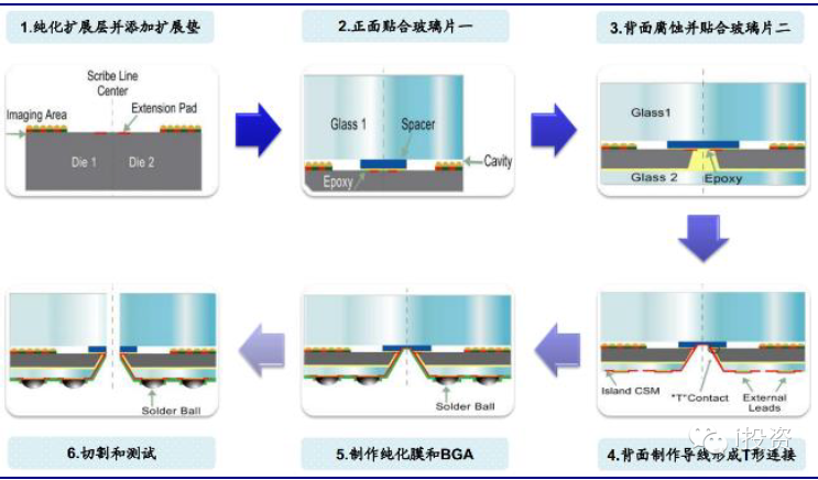Shellcase 系列 WLCSP 技术制作流程主要分为6 个步骤:1.纯化扩展层并添加扩展垫,2.正面贴合玻璃片一,3.背面腐蚀一个缺口并填充环氧树脂再贴合玻璃片二,4.通过沉淀法在背面制作导线并形成T 形连接,5.在背面制作钝化膜和球栅阵列结构(BGA),6.对晶圆片进行切割和测试。