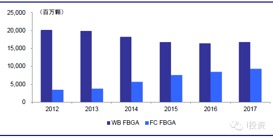在FBGA 领域,未来五年受益于Memory 封装和WLP 封装技术的增多,FC FBGA需求量将快速提升。据TechSearch 预测,FC FBGA 市场规模年复合增长率为22%,从2012 年的34 亿颗增长到2017 年的93 亿颗;而与之对应的传统WB FBGA 需求量则从202 万颗减少到168 万颗。从而,使得倒装技术在FBGA 中占比由2012 年的14%大幅提升到36%。