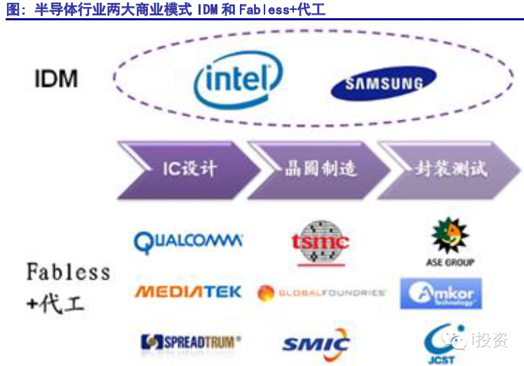 根据IC 设计、晶圆制造和封装测试这三个环节的不同组成方式,半导体行业存在两大商业模式:IDM和Fabless+代工。
