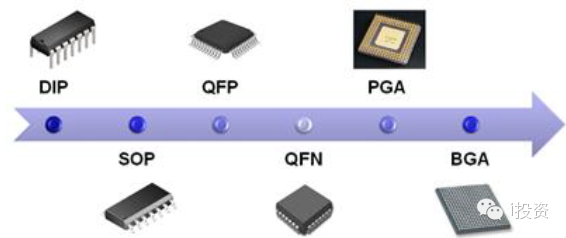 图:第一阶段芯片封装技术演进主要体现在外部引脚形状的改变