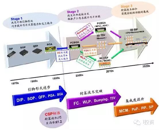 围绕着运算能力和交互能力的提升,芯片封装技术的历史演进过程可以分为三个阶段,分别体现为外部引脚形状的改变、内部连接方式的改变和封装技术融合三种不同的表现形式。