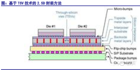 当前,TSV 技术应用最为广泛的是在2.5D 封装方法上,这是实现多芯片封装的基础。所谓2.5D 封装方法,就是把芯片用直径约为10um 的微型锡球贴合在一块硅中介层上,同时使用直径约为100um 的普通倒装芯片锡球连接到基板上,硅中介层的正反两面采用TSV 技术打通。基于TSV 技术的2.5D 封装方法,有效改进了由于芯片上线宽与基板上线宽相差几个数量级导致的对性能和功耗的影响,以及基板上线宽过宽导致的布线拥堵的问题。