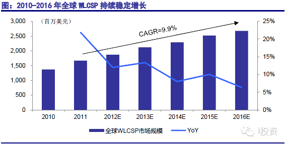 据Yole Developpement 统计,2011 年全球WLCSP 市场规模为17 亿美元左右,2016年将增加到27 亿美元,对应年复合增长率为9.9%,基本上整个WLCSP 市场保持持续稳定增长。