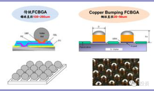 图:传统FCBGA 与先进Copper Bumping FCBGA 封装技术比较