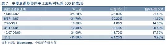 从经验来看,由于军工行业受信贷、消费和其他一般宏观因素的影响较小,并且政府一般在经济衰退期增加军费开支来进行对冲,所以往往在经济衰退期军工股具有一定的防御功能。在美国最近的三次经济衰退中,军工股的表现均要好于标普 500。