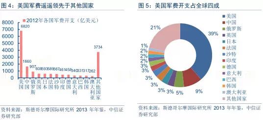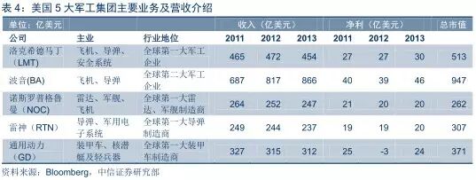 2012 年美国军费开支超过 6800 亿美元,占全球军费开支约四成,占其本国 GDP 的 4%;美国拥有全球最先进的军事技术,坦克、战机、舰艇、导弹等各方面的经典产品比比皆是,并在核武器、电子战、指挥系统、空天一体化方面遥遥领先。经过数十年的整合,美国军工行业集中度已经达到较高水平,形成了洛克希德马丁、波音、诺思罗普格鲁曼、雷神、通用动力、联合技术等寡头企业竞争的格局。这些军工集团基本垄断了美国国防部的一级承包项目,收入和市值均达到了数百亿美金。在美国军工产业快速发展的同时,其军事技术也大量应用于民用领域,如波音公司成功将军用飞机技术应用于民航飞机,成为全球民航飞机市场的双寡头之一。