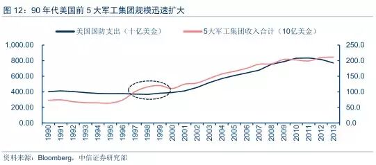 (4)冷战结束后军工产业进入转型期。由于国际局势缓和,各国开始缩减军费开支,美国军工企业开始大规模的收购兼并浪潮,行业集中度开始急剧上升。