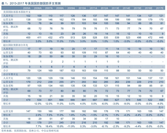 2011 年末美国财政控制法案获得美国政府和议会通过,依照该法案,未来十年美国将降低国防预算合计 4870 亿美金。这就意味着如果该法案得到有效实施,美国军工行业未来的增长空间将受到限制。在美国国防部公布军费开支减少计划的基础上,美林公司对美国国防开支进行了预测,预计 2013-2017 年美国国防开支分别为 5730、5460、5210 和 4980 亿元,每年将以大约 5%的速度递减。