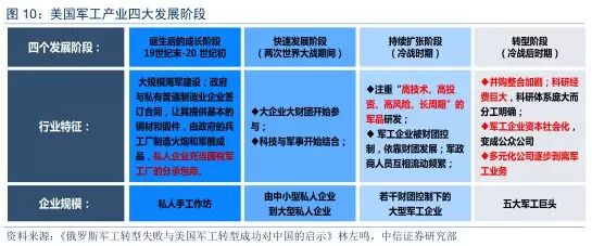相比于美国,中国军工产业仍处于起步阶段。中国军工产业长期在计划体制下发展,和美国军事工业在组织结构上具有根本性的区别,因此股票市场对中国军工股的投资逻辑和美国市场也不尽相同。然而,中国军工行业正迎来历史性变革,这一变革不仅体现在武器装备投入上,同时也体现为军工企业类资产注入的持续推进,以及军队体制编制、军品定价机制、军民结合、管理层持股、军工科研院所改制等一系列变革中。我们认为在当前时点学习美国军工行业的历史经验以及美国市场对军工行业的研究方法具有重要的意义。