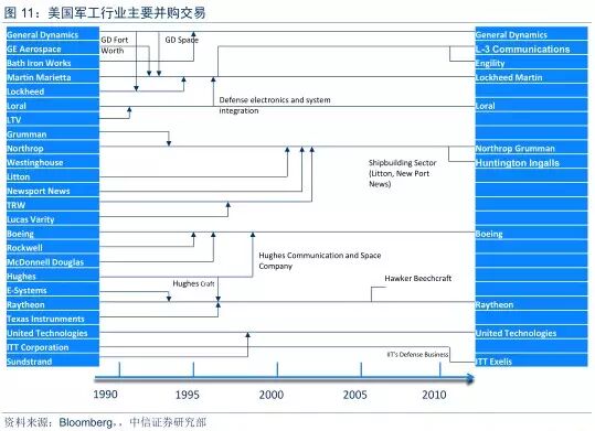 美国军工行业大规模并购浪潮自90 年代初开始,如马丁玛丽埃塔公司先后收购 GE 宇航公司和洛克希德公司,并共同组成洛克希德马丁公司,之后洛克希德马丁公司又收购了通用动力的军用飞机分部和劳拉国防公司,而此前劳拉公司已经收购了 LTV 的导弹分部、IBM系统公司和尤尼西斯国防公司;波音公司先后收购了罗克韦尔国防公司和麦道公司;雷神公司先后收购了 E 系统公司、休斯飞机公司和德州仪器军工分部;诺思罗普先后收购了格鲁曼公司、西屋国防电子公司,组成了当前的诺斯罗普格鲁曼公司。