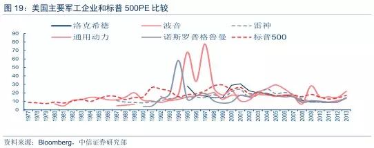 从历史上看,美国主要军工企业的估值波动不大,估值中枢在 12-18 倍之间,并且围绕标普 500 上下波动。有几家军工企业在90 年代享受过高估值,主要原因为当时波音和诺思罗普格鲁曼均处于盈利低谷,并且处于行业整合期,收购兼并等预期导致公司能够享受高估值。