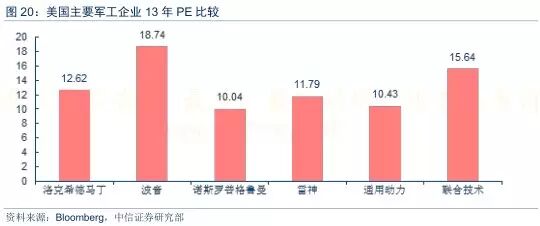从当前的估值来看,美国主要军工企业相对 2013 年静态 PE 区间在 10-18 倍,其中波音公司因为民用产品占比较高,受全球经济复苏弹性较大,因此享受较高估值。