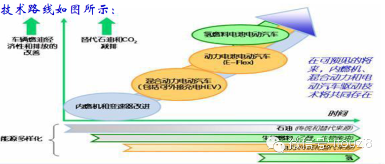 以通用公司为代表,主要加强内燃机和变速器等传统技术优化,研发重点是Plug-in插电式电动汽车;远期发展重点是氢燃料电池的电动汽车。