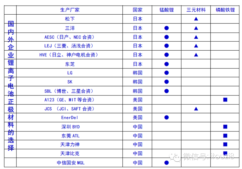 目前国际上电池厂家大多选择锰酸锂和三元材料,国内电池厂家大多选择磷酸铁锂(比亚迪用的就是磷酸铁锂技术)。