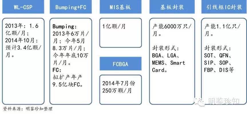 长电科技:贯彻“适度发展传统封装,重点发展高端封装,加快发展特色封装”的产品结构调整战略,是长电科技打破业界“摩尔定律”宿命论的破题之作。公司主要的业务分为低端、中阶QFN、基板封装(包括FC)、先进封装(Bumping与WLCSP)等。低阶封装由滁州工厂和宿迁工厂生产线负责,2014H1滁州工厂营收5.57亿元,净利润1,860.59万元;宿迁工厂1.62亿元,净利润-1,228.37万元,合计净利润633万。中阶封装产品由长电科技本部生产线负责,主要基板封装(包括BGA、FCBGA)高引脚的引线框封装(QFN、QFP、SOP、TSOP、DIP)等。高阶封装产品主要由长电先进生产线负责,主要包括Bump/WLCSP/SiP/FC/TSV五大圆片级封装技术等,2014H1长电先进营业收入6.17亿元,净利润6,755.08万元。此外新晟电子(影像传感器封装)也是高阶封装,2014H1新晟电子营业收入1.51亿元,净利润723.02万元。根据2013年财务数据初略测算,我们预计公司高阶封装占比18%;中阶封装占比52%;低阶封装占比26%。