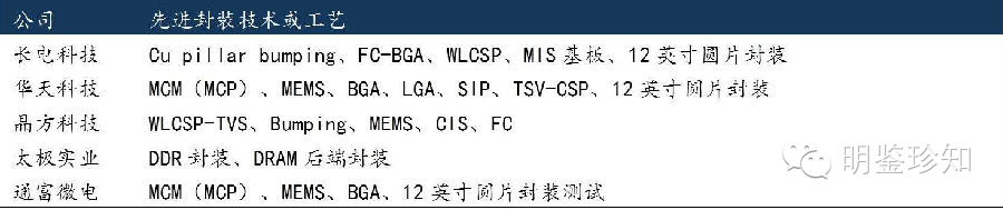 西安华天(原西安天胜电子):主要进行Flip-Chip、BGA、QFN 等中端封装产品的生产。人力成本较低同时又具备人才优势。2014年7月,西安华天准备投资5.26 亿元建设“FC+WB 封装项目”,该项目与昆山华天Bumping生产线相配套,建设期3年,达产后年新增FCBGA、FCCSP、FCPGA、BGA、LGA、QFN、DFN 系列集成电路先进封装测试能力2 亿块,有望贡献5.70 亿元收入和4,627 万元净利润。